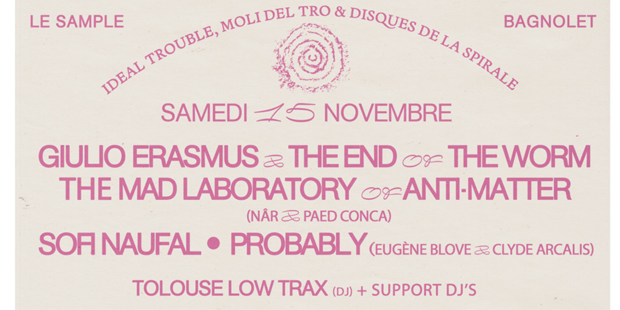 Grammaire réduite et anticipation d’un nouveau passé le 15 novembre au Sample à Bagnolet – ideal trouble, moli del tro et disques de la spirale y proposeront dès 16h :