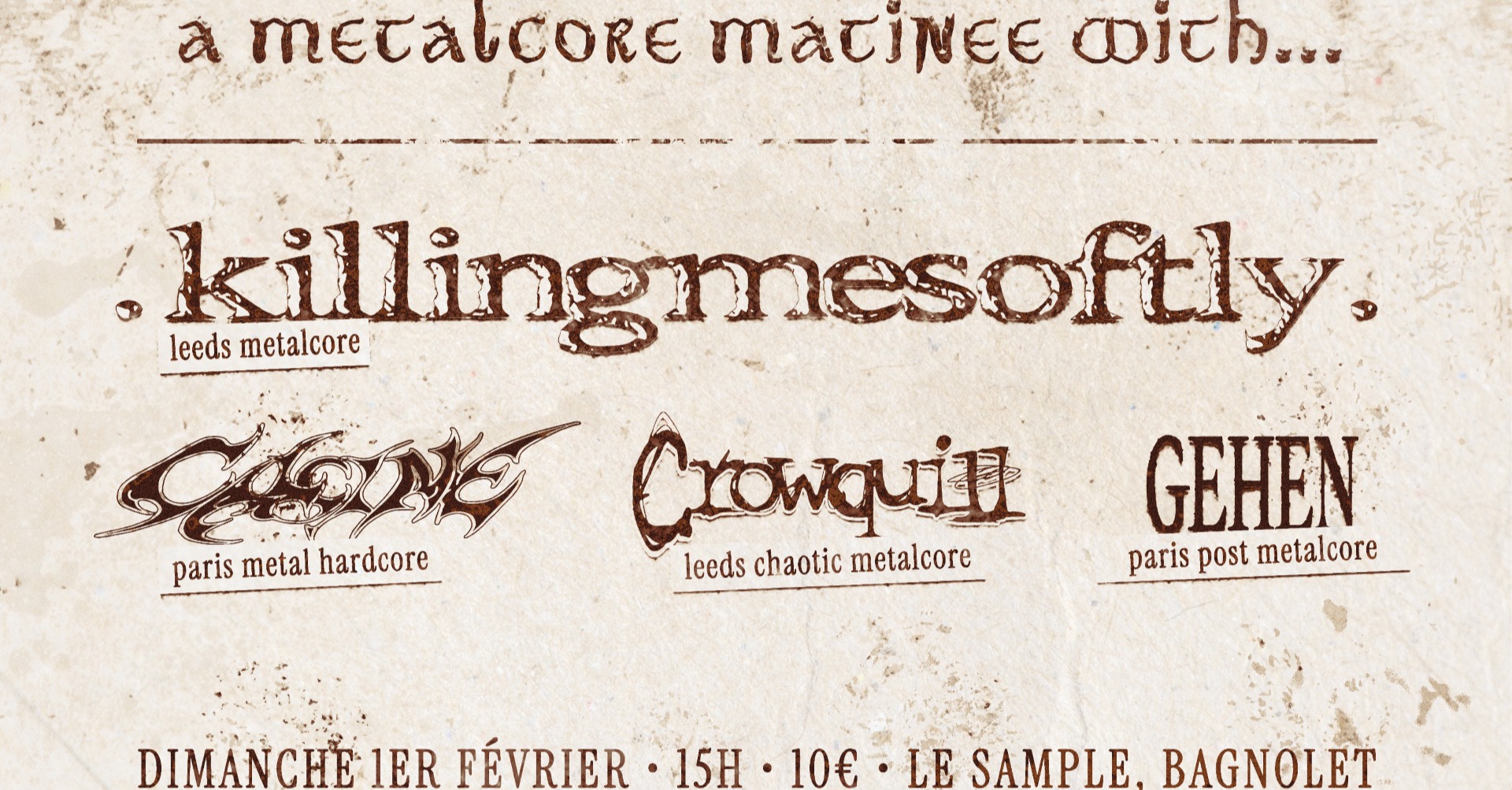Parmi les têtes de file du revival metalcore anglais, Killing Me Softly reviennent à Paris pour un matinee show bien rempli, avec les incontournables Calcine, le metalcore chaotique de Crowquill, et les kids de Gehen.